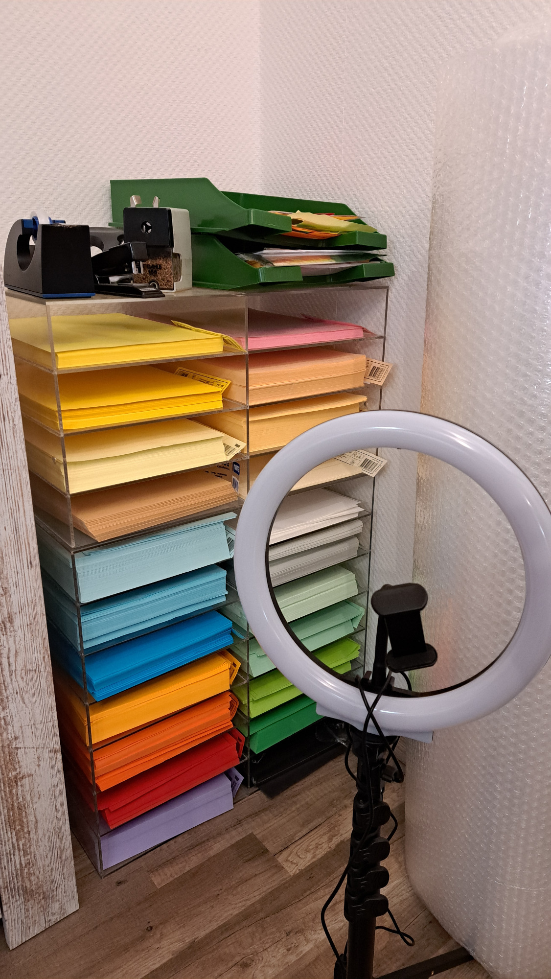 Mein Lager ist immer gut gefüllt mit 22 verschiedenen Farbtönen. Sie besthen aus den Marken Clairfontaine, Tecno Colors und Rainbow. Ich verwende hauptsächlich 80 Gramm Papier für alle Modelle.